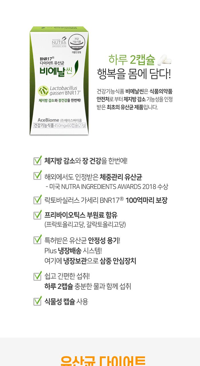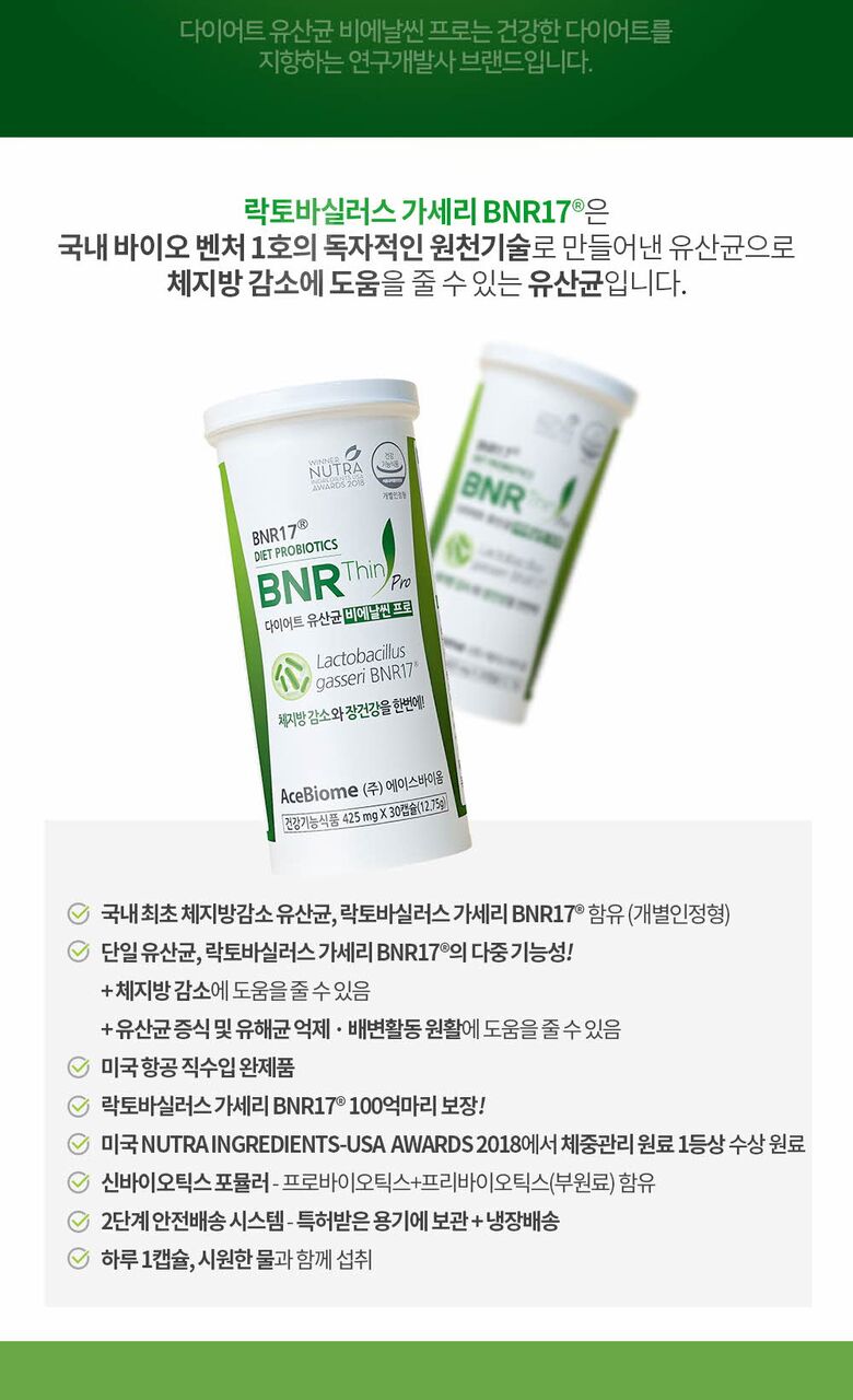 BNR17은 Lactobacillus gasseri BNR17 균주를 포함한 다이어트 유산균이에요. 이 제품은 체중 관리와 장 건강에 도움을 주는 것으로 알려져 있어요. 특히, 2018년 Nutra Ingredients Awards에서 수상한 이력이 있어요. 이 제품은 안전한 프로바이오틱스 안정화 기술을 사용하여, 하루에 두 캡슐만 섭취하면 된답니다.