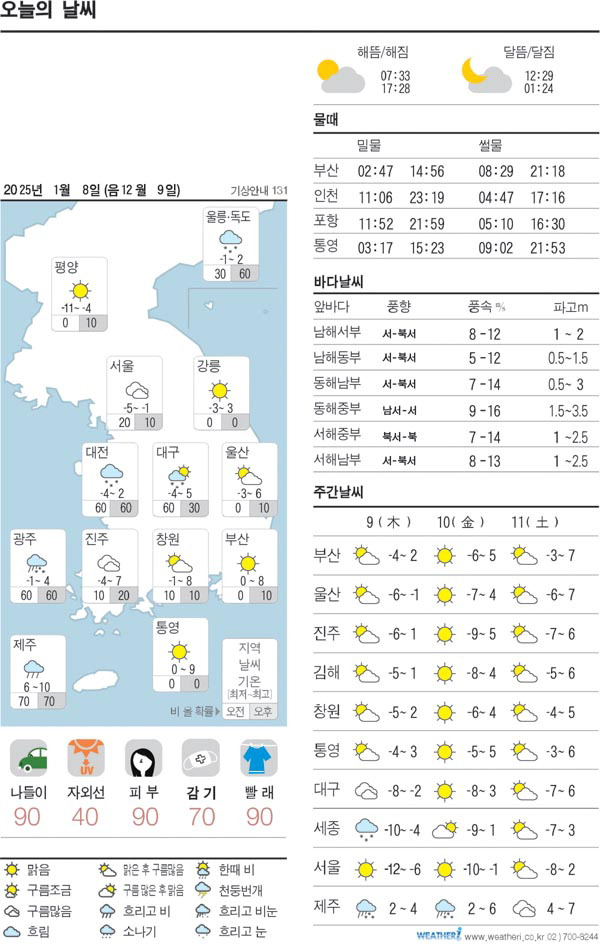 [2] 조선일보 - [오늘의 날씨] 2025년 1월 8일 (https://www.chosun.com/national/national_general/2025/01/08/M7QKZCE64NF77LNEUGO2DUGULE/)