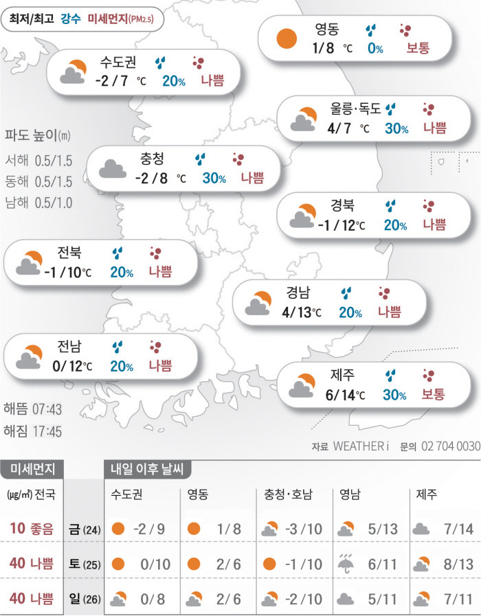 서울과 인천은 오늘 기온이 -1도에서 0도 사이로 예상되고, 대체로 흐린 날씨가 지속될 것 같아요. 반면에 부산은 기온이 0도에서 4도 사이로, 맑은 날씨를 보일 것으로 보이네요. 제주도는 기온이 6도에서 14도 사이로, 비가 올 확률이 30%로 예상되고 있어요.