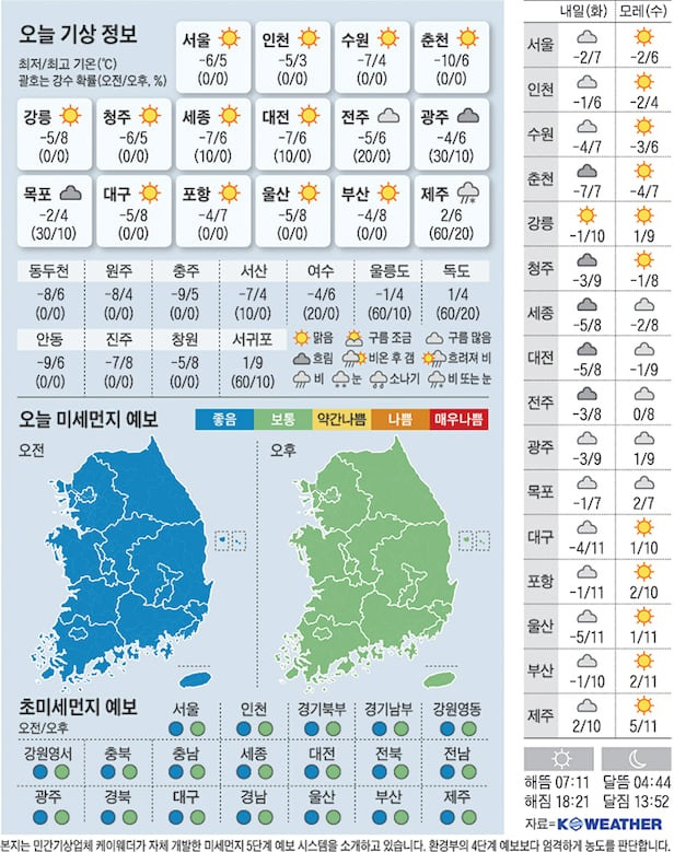 - 서울 : 낮 최고 기온 5도, 아침 기온은 영하 2도. 맑은 날씨가 지속될 것으로 보여요.