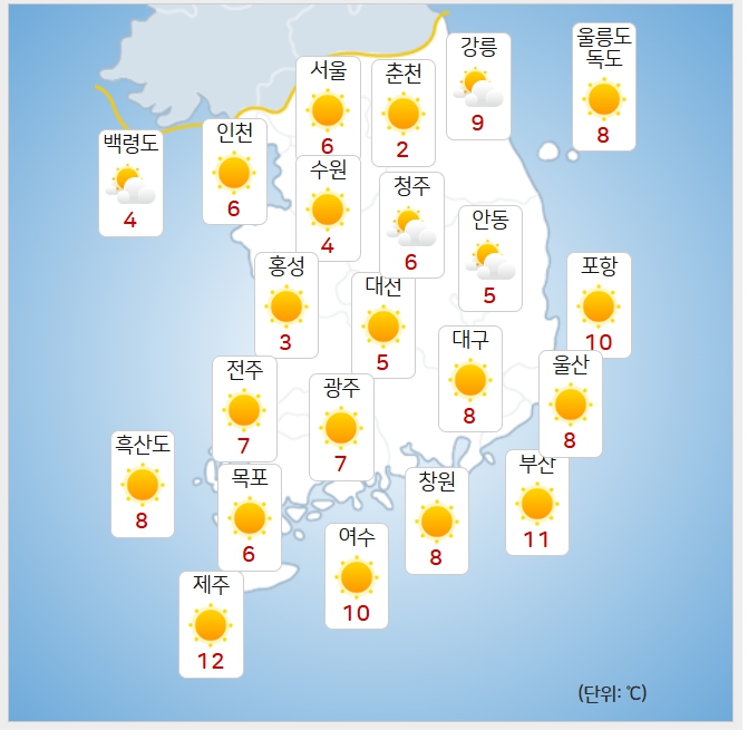 오늘은 전국적으로 기온이 다소 낮고, 일부 지역에서는 비가 내릴 것으로 예상돼요. 서울은 아침 기온이 6도에서 시작해 낮에는 22도까지 오를 것으로 보이네요. 부산은 9도에서 시작해 낮 최고 기온이 22도에 이를 것으로 예상돼요. 제주도는 11도에서 시작해 18도까지 오를 것으로 보입니다. 전반적으로 기온 차가 크지 않지만, 바람이 불어 체감 온도는 더 낮게 느껴질 수 있어요.