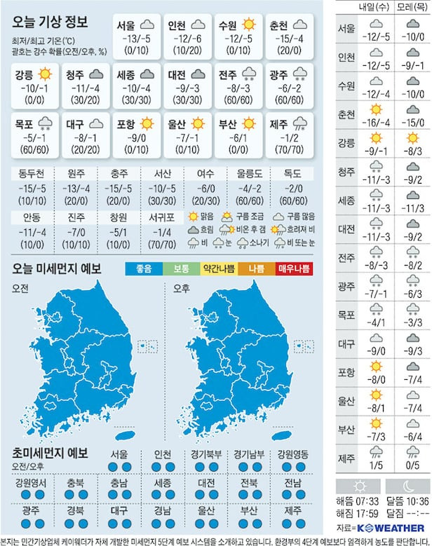 오늘 서울, 인천, 부산 등 주요 도시의 기온은 다음과 같아요. 서울은 -12도, 인천도 비슷한 기온을 보이고 있어요. 부산은 조금 더 따뜻하지만, 여전히 쌀쌀한 날씨가 계속되고 있답니다.