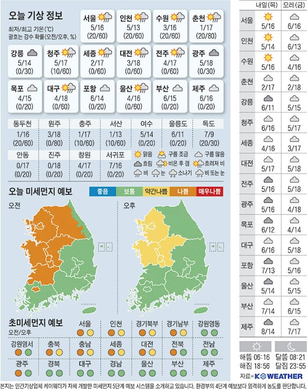 이 지도는 오늘의 날씨를 이해하는 데 큰 도움이 되죠. 또한, 일출과 일몰 시간, 달의 위상 정보도 함께 제공되니 참고하면 좋겠어요.