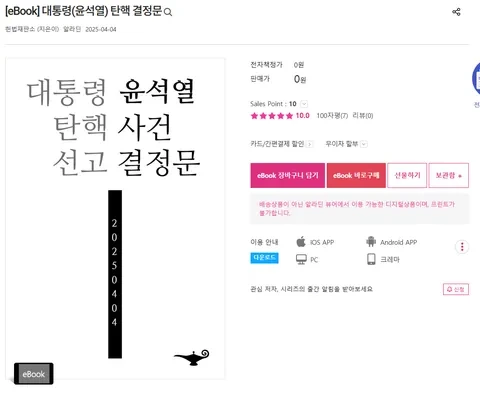 [2] 알라딘 - [전자책] 대통령(윤석열) 탄핵 결정문 (https://www.aladin.co.kr/shop/wproduct.aspx?ItemId=361836435&srsltid=AfmBOorFgufmfXsLz_f9EabIYS4uKu8WH9Jtx_3VfdR29kbV08xMv7hf)