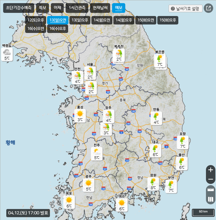[4] YouTube · KBS News - [날씨] 내일(13일)도 곳곳에 비…강한 바람 주의 / KBS 2025.04.12. (https://www.youtube.com/watch?v=WzaxuCHc3Uc)