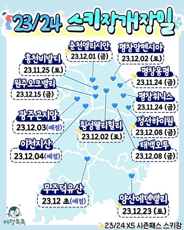 [1] 여행톡톡 - 2024/2025 전국 스키장 개장일 총정리 (+X5 시즌패스) (https://www.tourtoctoc.com/news/articleView.html?idxno=7211)